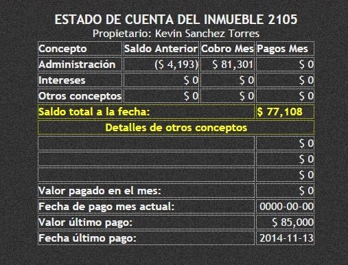 Genera un informe con saldos actualizados a nivel global de toda la Propiedad Horizontal relacionando cada uno de los inmuebles y descargarlo en formato de hoja de cálculo. Permite general una consulta por un inmueble específico. Cada copropietario puede consultar el estado de cuenta detallado de su inmueble, a no ser que se encuentre en proceso de cobro jurídico. |